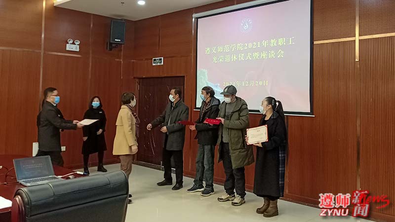 曾伯平宣读遵义师范学院2021年教职工荣休名单。与会校领导为2021年光荣退休教职工颁发荣休证书、纪念品。