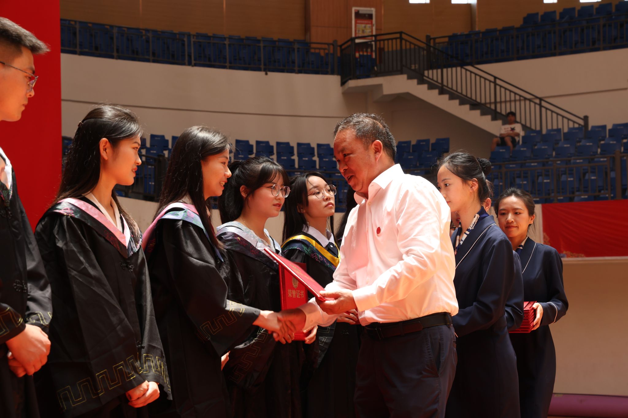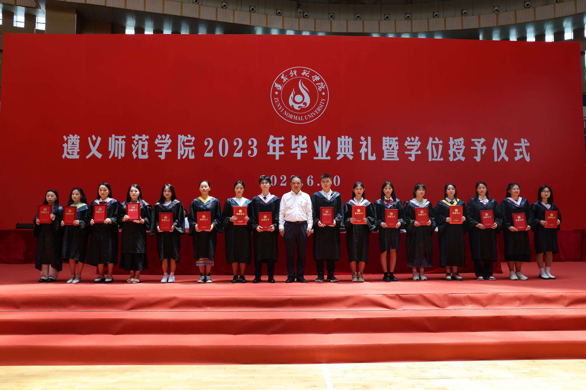 全场师生齐唱国歌后,曾伯平宣读《关于表彰遵义师范学院2023届优秀大学毕业生的决定》《省教育厅关于2023届贵州省普通高等学校优秀毕业生评审结果的通报》,刘肇军为遵义师范学院优秀大学毕业生代表颁奖,张波为贵州省优秀大学毕业生代表颁奖。