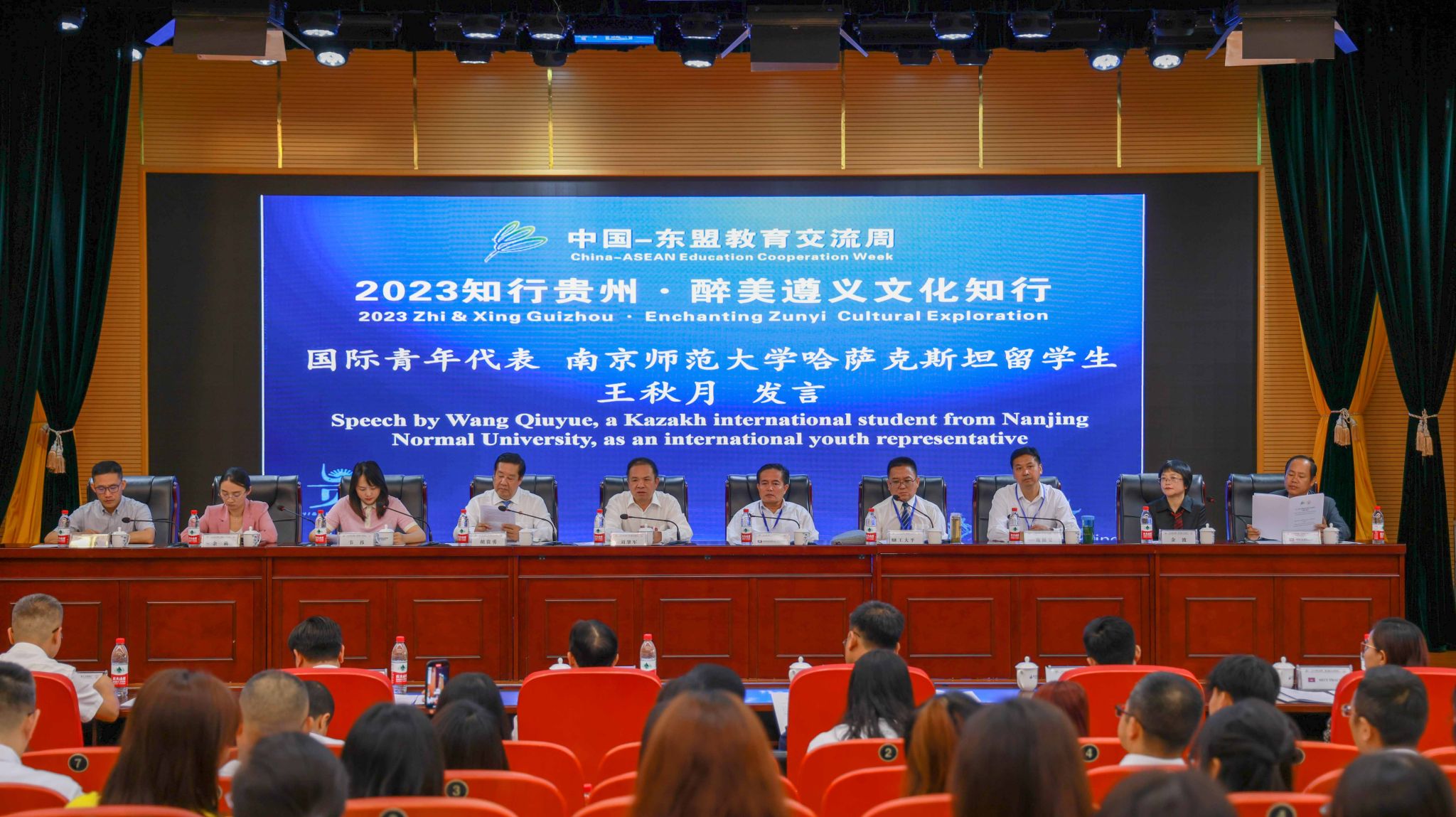 9月18日上午,2023年知行贵州•醉美遵义文化知行在遵义师范学院开幕。老挝波里坎赛省教育与体育厅党委副书记、副厅长KOUNNAVONG PHOPHET,遵义市文化旅游局党组成员、副局长韦祎,遵义市人民政府办公室二级调研员余波,遵义师范学院党委副书记、校长刘肇军,党委委员、副校长胡贵勇,党委委员、宣传部部长王春华,南京师范大学、云南师范大学、茅台学院、柬埔寨克鲁扬学校等有关负责人、国际青年代表等参加开幕式。