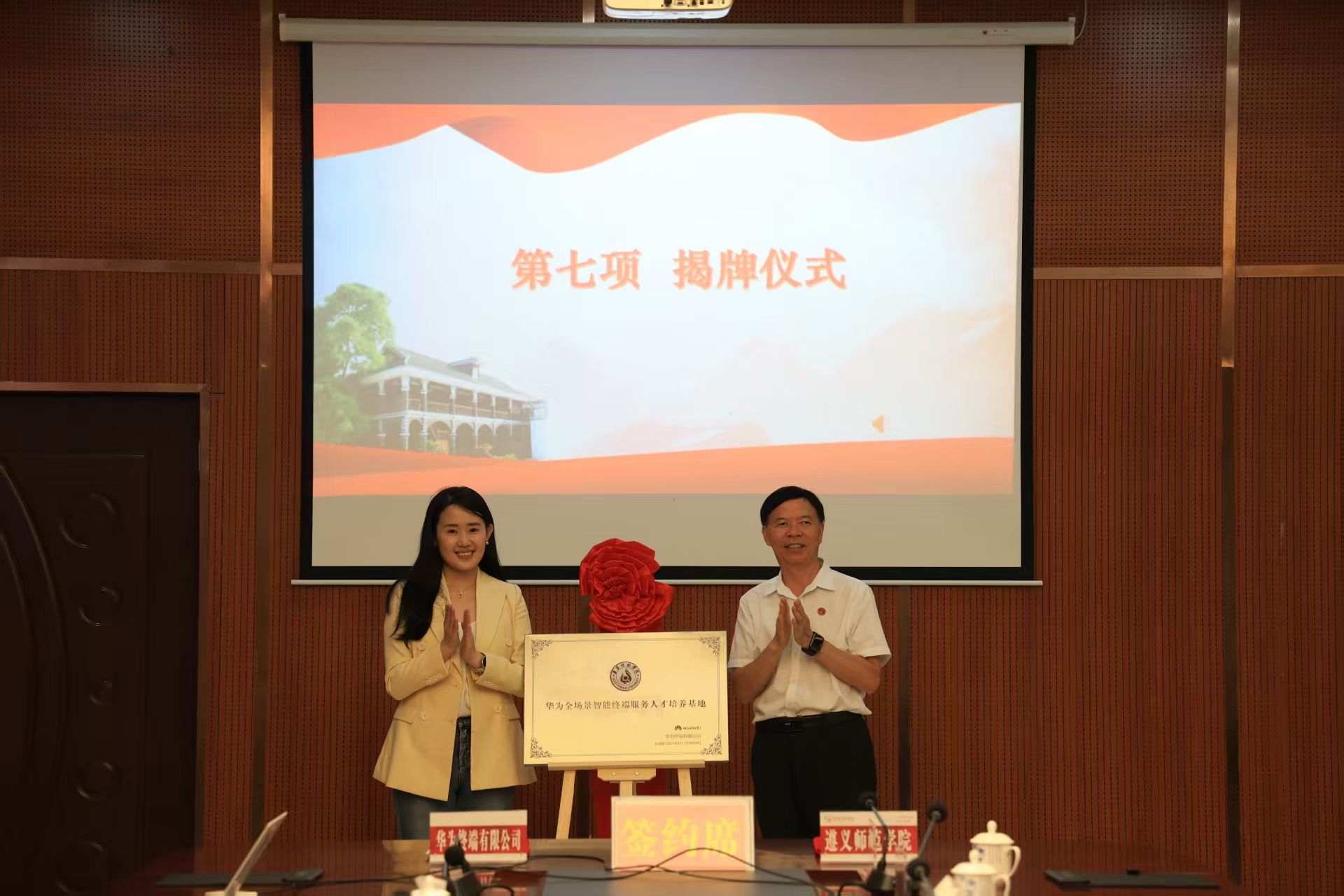 在与会代表的共同见证下,遵义师范学院副校长张鹏与华为贵州终端业务部HR总监梁婷作为双方代表签约,陈治松与梁婷共同为全场景智能终端服务人才培养基地揭牌,现场掌声热烈,将仪式推向高潮。