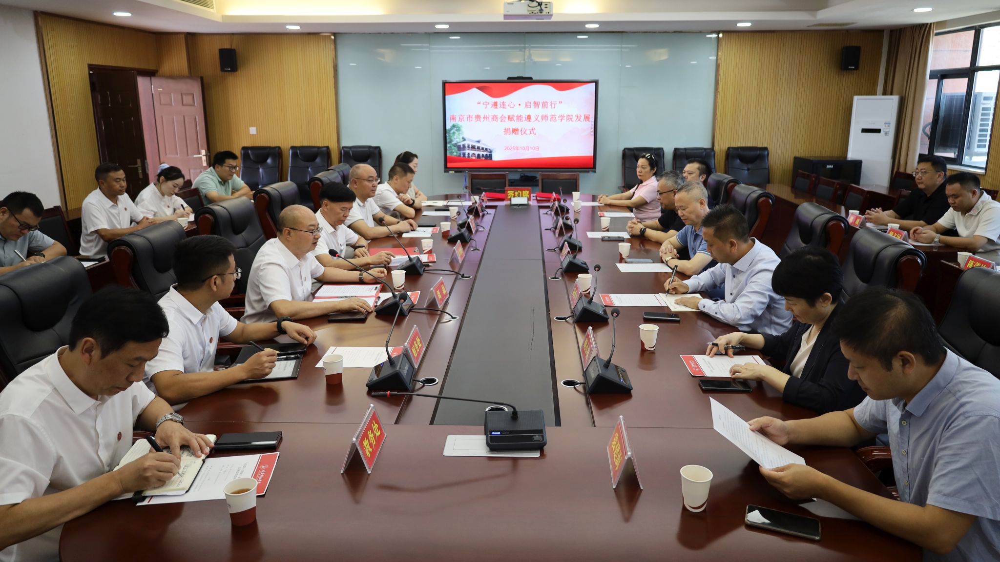 本网讯(文/施宣 图/周选州) 10月10日,“宁遵连心·启智前行”南京市贵州商会赋能遵义师范学院发展捐赠仪式在学校行政楼418会议室举行。双方将构建“资助—培养—就业—实践”的全链条赋能体系,助力学校提升人才培养质量和学生就业能力,为商会会员企业输送更多高素质专业人才,促进区域经济社会发展。