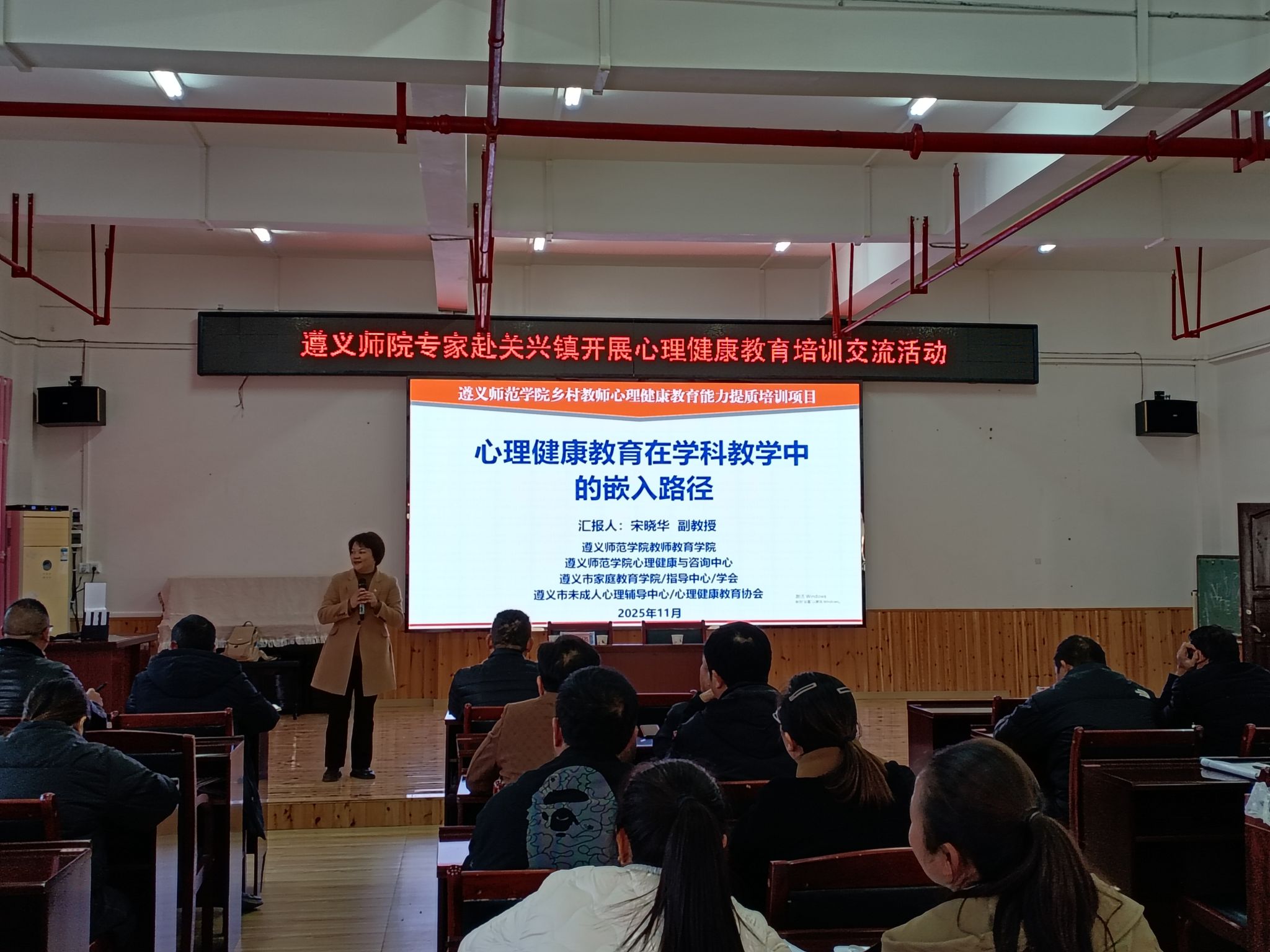 针对乡村学校普遍存在的心理健康教育资源匮乏、师资能力薄弱等难题,教师教育学院心理学教研室党支部为关兴小学全体教师带来了中小学心理健康教育专题辅导,并进行了交流。国家二级心理咨询师、遵义市未成年人心理健康教育协会秘书长、教师教育学院副教授宋晓华作了题为《心理健康教育在学科教学中的嵌入路径》的培训。培训通过“专题讲座+经验分享+问题研讨”的形式,深入剖析心理健康教育在学科教学中的嵌入路径,系统介绍“课程设计—课堂渗透—课后干预”的全链条工作法,并针对该校心理健康教育堵点问题提出改进建议,为乡村教师送上专业赋能“大礼包”。